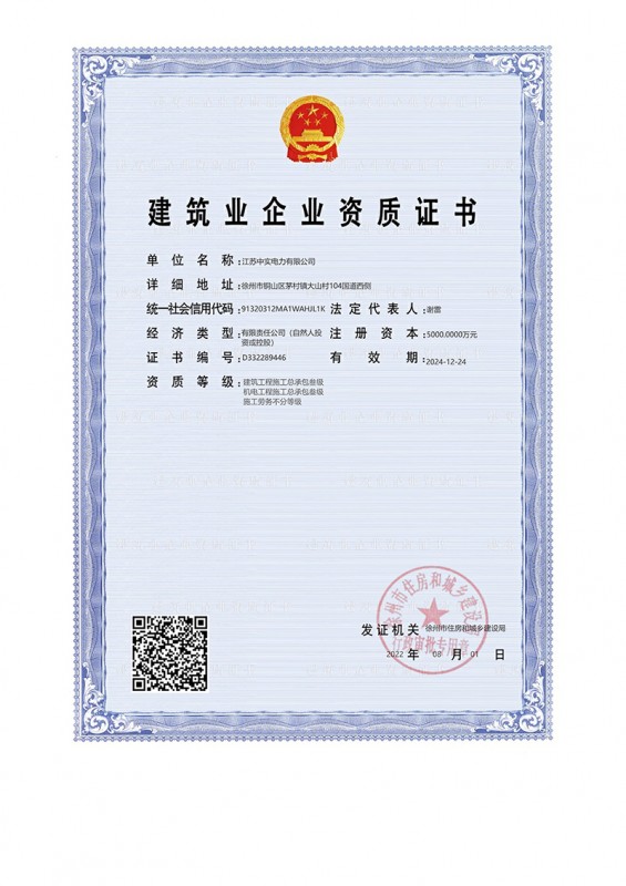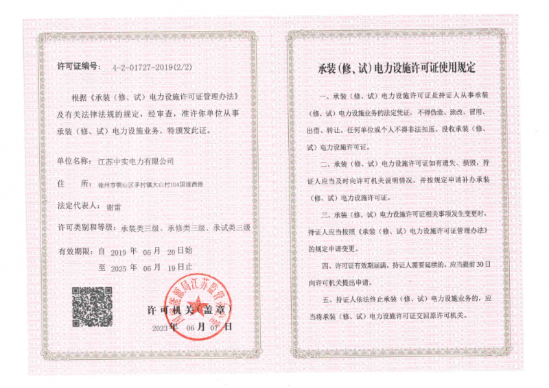 江蘇中實(shí)電力有限公司承裝承修試承證書